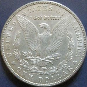 The coin you see (click on either image for a larger view) has no mint mark appearing on the lower reverse (above the D and O) and, therefore, was minted in Philadelphia. Like all Morgan and Peace dollars, this coin contains .77344 ounces of silver if it hasn't been in circulation. For circulated silver dollars (showing some wear on the images) it is considered to contain .7650 ounces of silver unless heavily worn. This coin is in very good condition and would probably be graded AU 55 or 58.